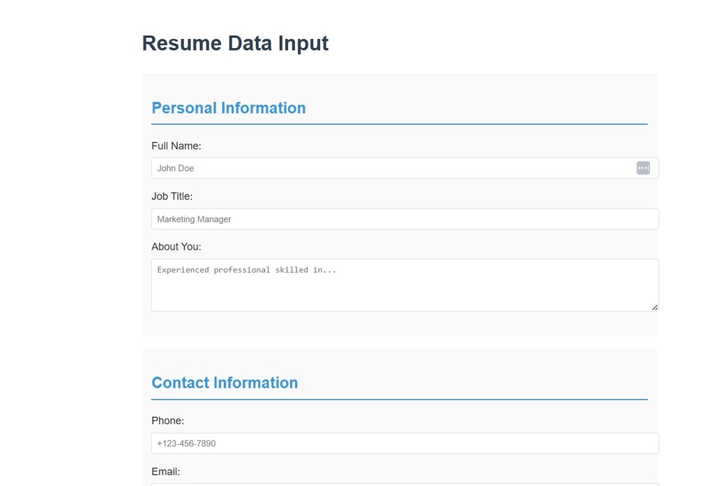 📁 MyResume/ ├── 📄 index.html # The main resume page ├── 📄 form.html # The resume builder form ├── 📄 data.json # Stores your resume data ├── 📄 style.css # Visual styling ├── 📄 main.js # Loads data into index.html ├── 📄 form.js # Form functionality └── 📁 assets/ └── 📄 profile.jpg # Your profile photo